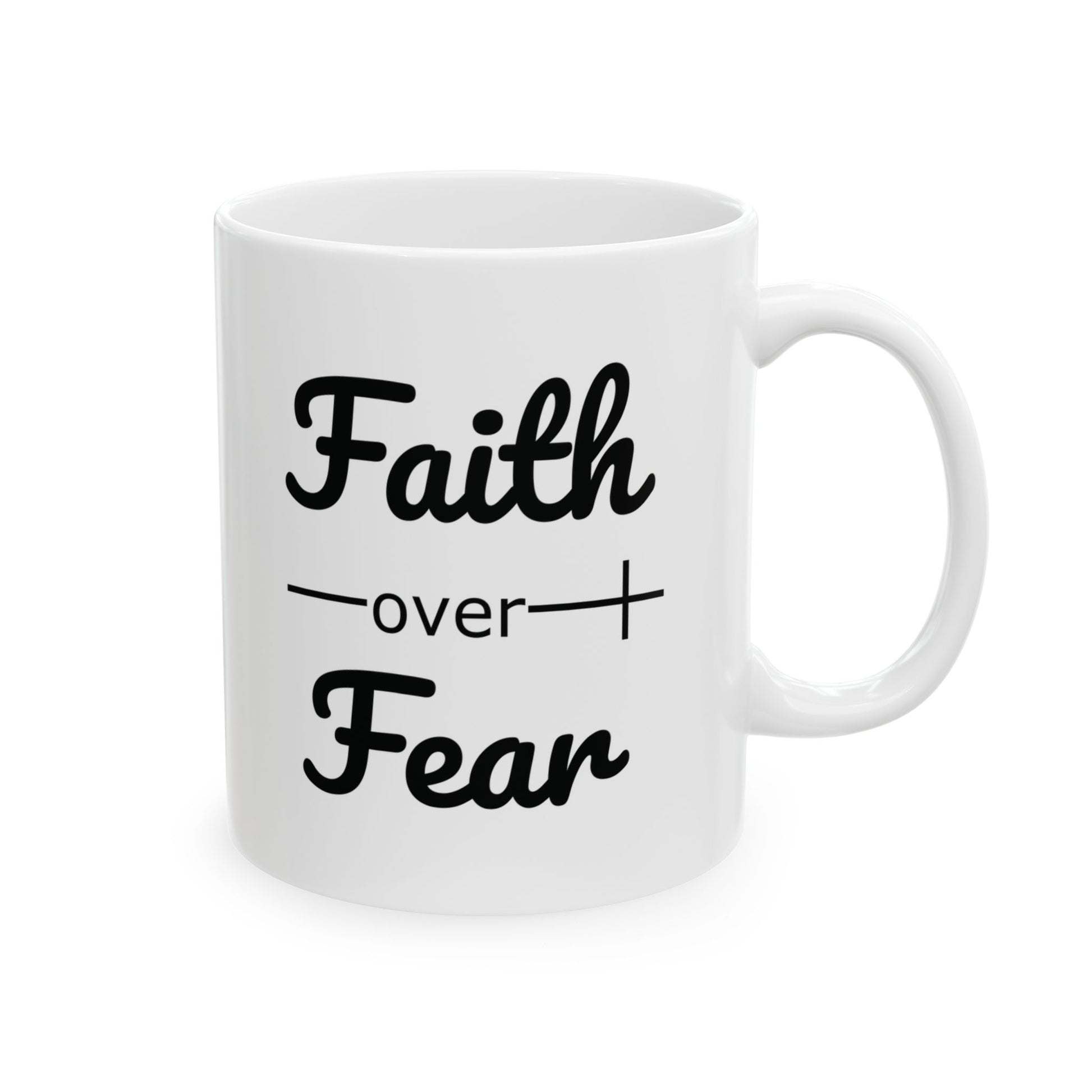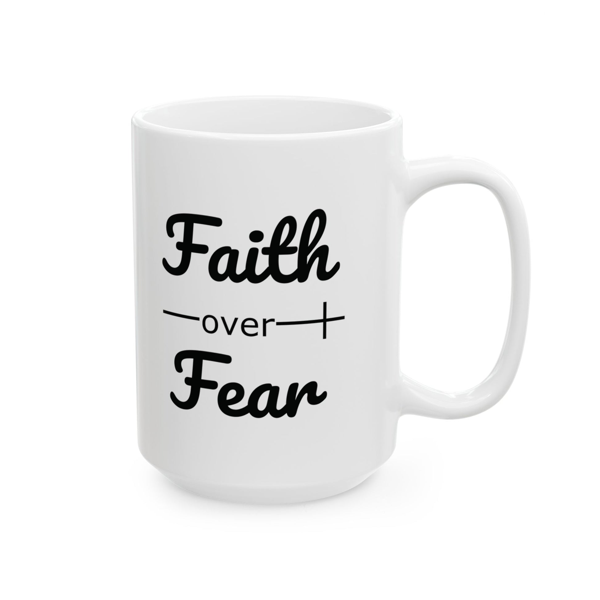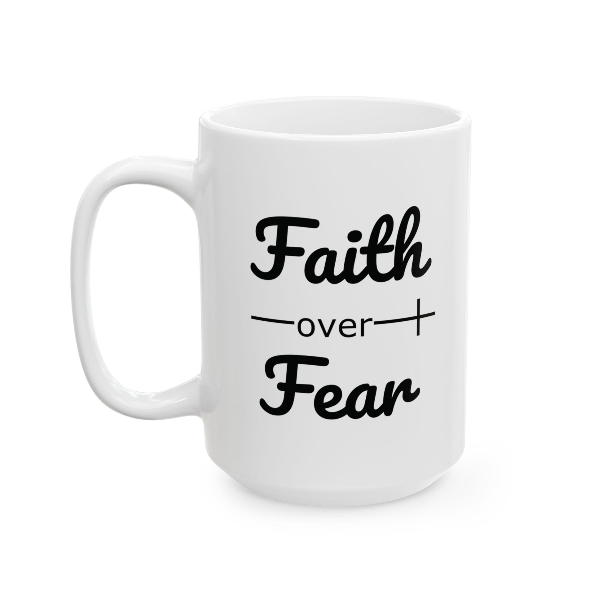 - Start your day with a boost of faith and inspiration with our "Faith Over Fear" Ceramic Coffee Mug.