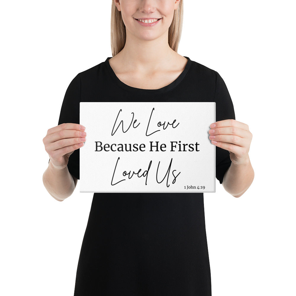 - Celebrate the foundation of true love with our "We Love Because He Loved Us First" 12x8 Christian Bible Verse Wall Canvas. Inspired by 1 John 4:19, this beautifully designed piece is a reminder that God’s love is the source of all love.